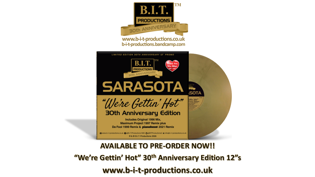 As above but also includes a copy of BIT30-4 SARASOTA “We’re Gettin’ Hot” 30th Anniversary Edition on GOLD Vinyl with poly-lined inner sleeve, 3mm spine colour printed gloss varnish cover and protective outer sleeve. These Limited Edition Deluxe copies will also come with a SUPER DELUXE Signed & Numbered B.I.T. Productions Certificate of Authenticity.
