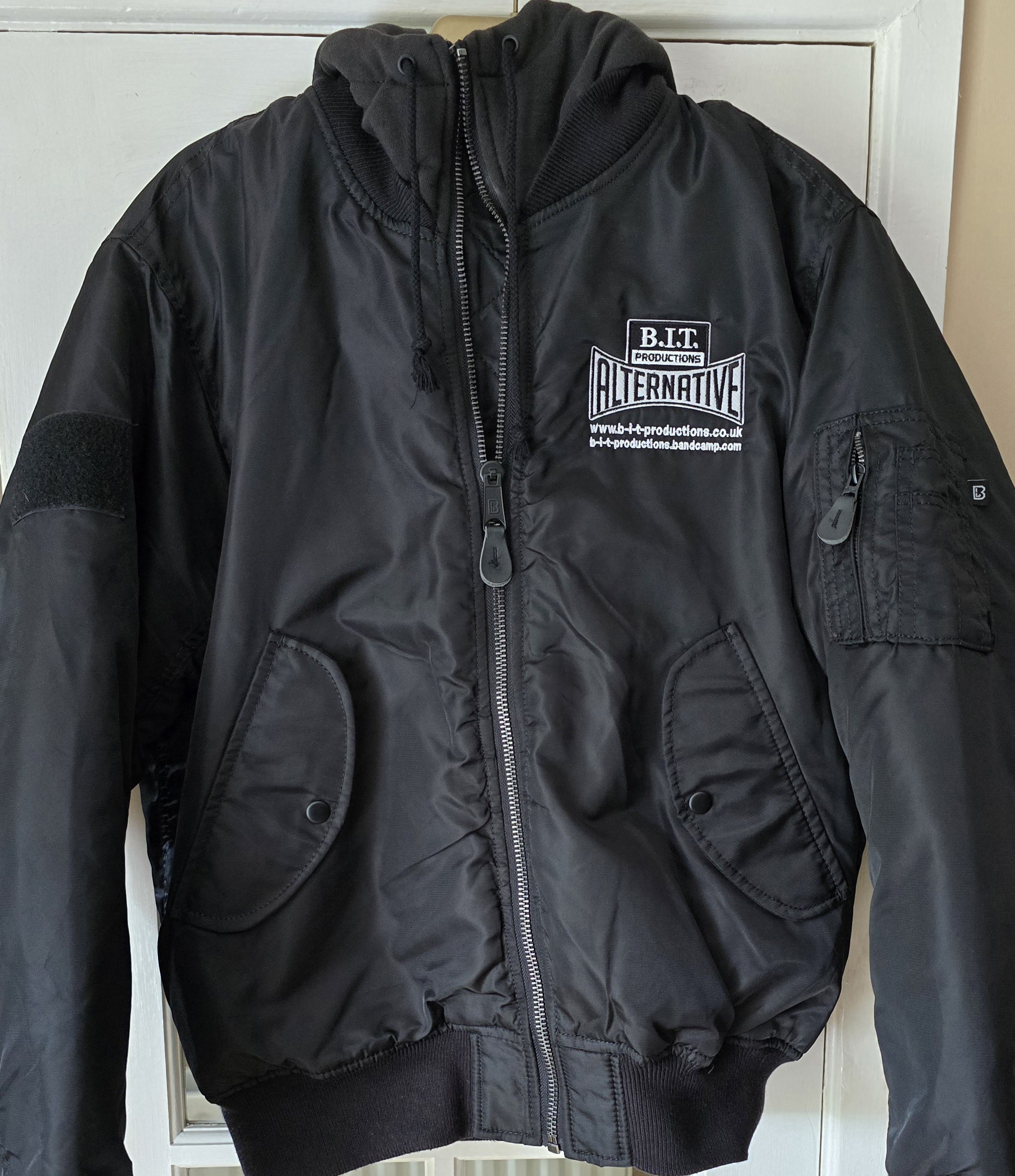 Brandit MA1 Jackets with either B.I.T. Productions 30th Anniversary logos or ALTERNATIVE Logos embroidered on the front and rear. ALTERNATIVE is Hooded MA1